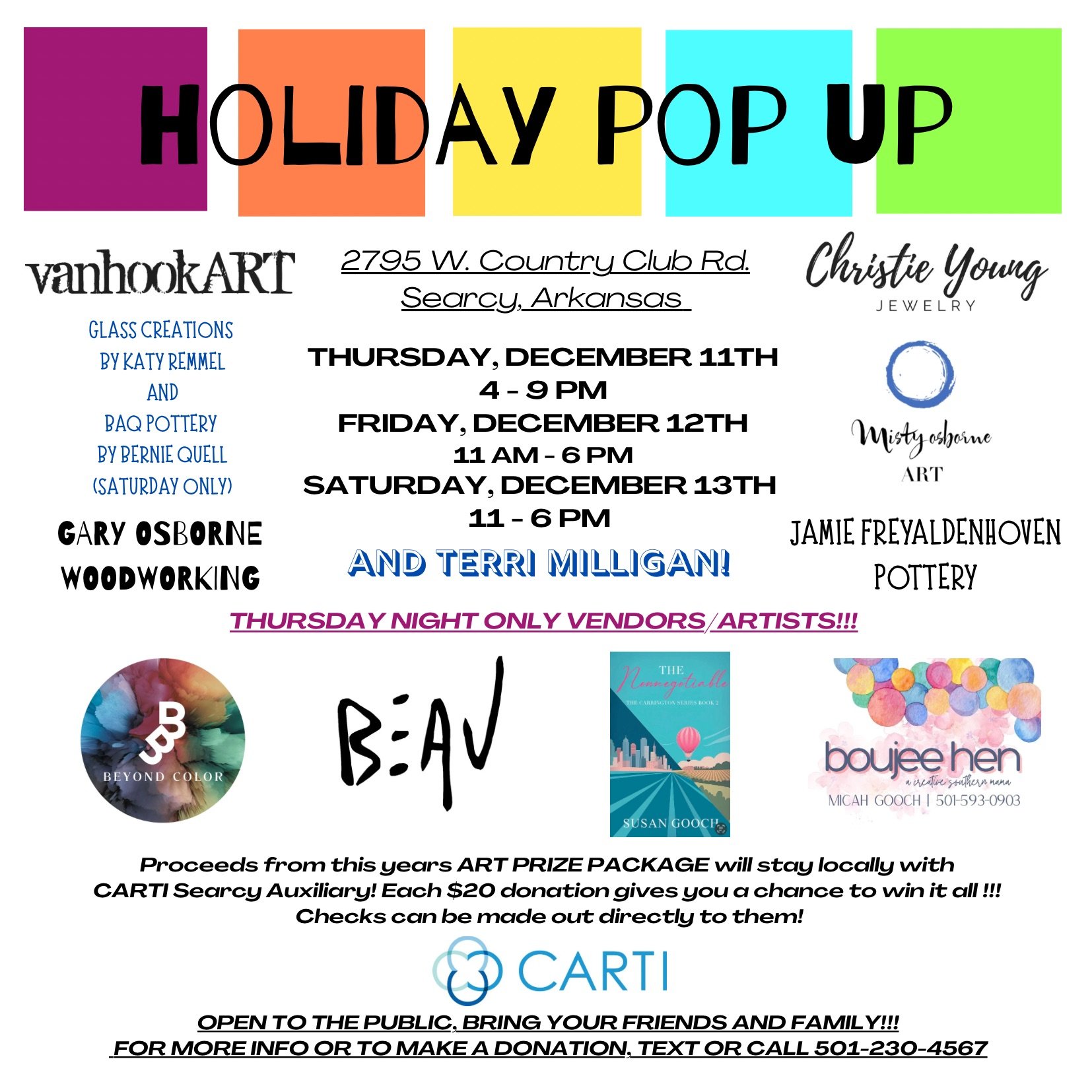 Holiday Pop Up Event: Vanhook Art Thursday, December 11, 2025 4:00 PM Saturday, December 13, 2025 6:00 PM 2795 West Country Club Road Searcy, AR, 72143 United States (map) Google Calendar ICS